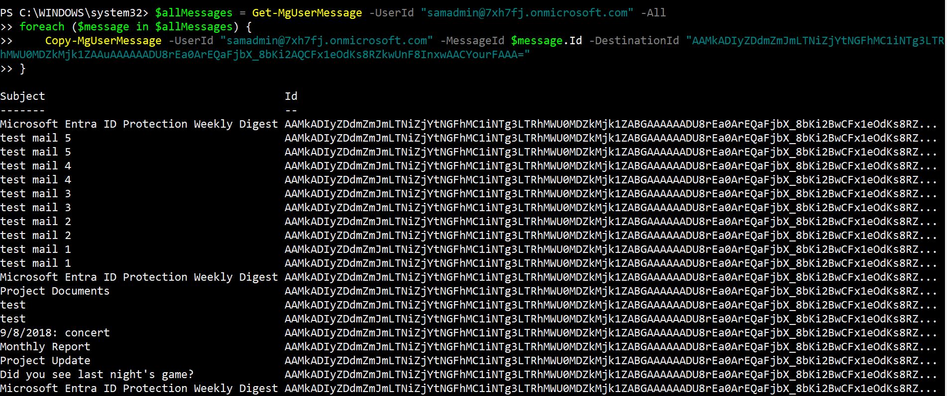 The Copy-MgUserMessage cmdlet in Microsoft Graph PowerShell is a powerful tool that allows administrators to copy email messages from one folder to another within a user's mailbox. This cmdlet is particularly useful for managing and organizing emails in bulk or based on specific conditions.