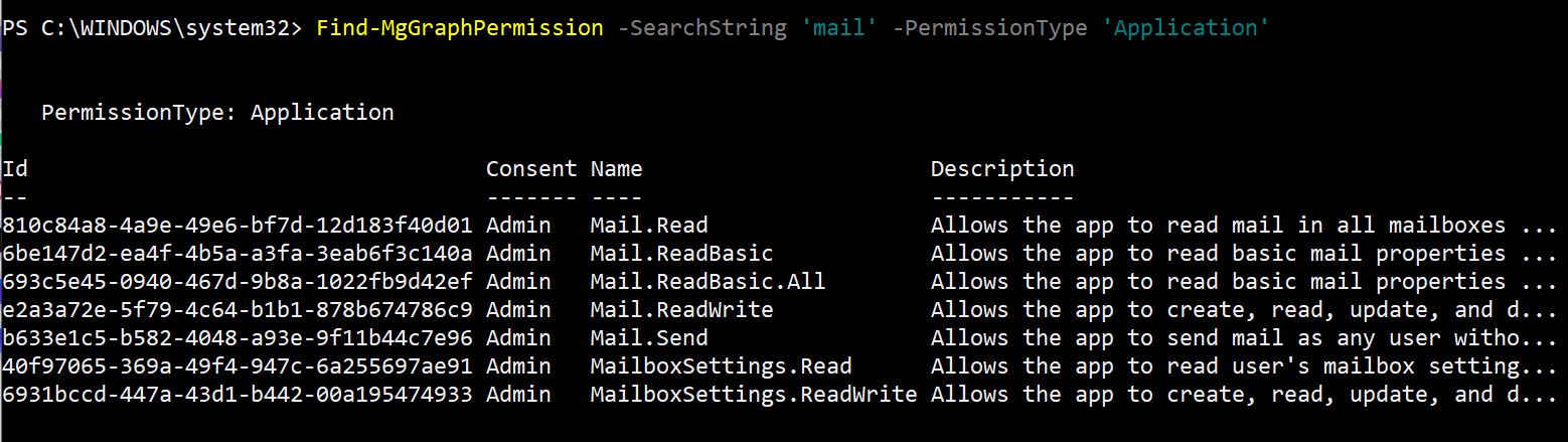 This command searches for application permissions that include the word "mail". It fetches only the application permission needed for quering the mail resource.