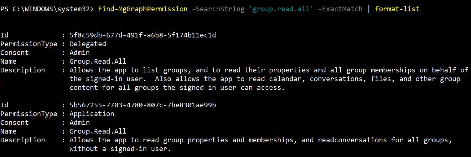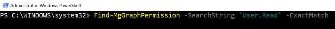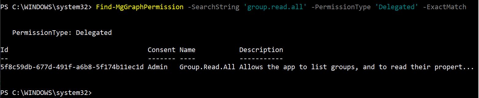 If you are sure about the permission you are searching for, then you can pass the permission name to -SearchString and look for the -ExactMatch as follows. You'll get back the permission type, what it offers, and whether admin consent is required for the permission.