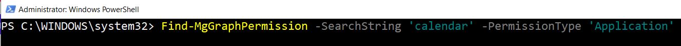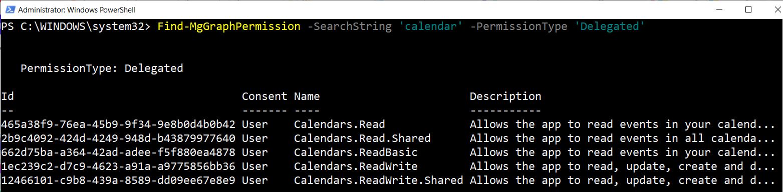 This command searches for delegated permissions that include the word "calendar". It fetches only the delegated permission needed for quering the calendar resource.