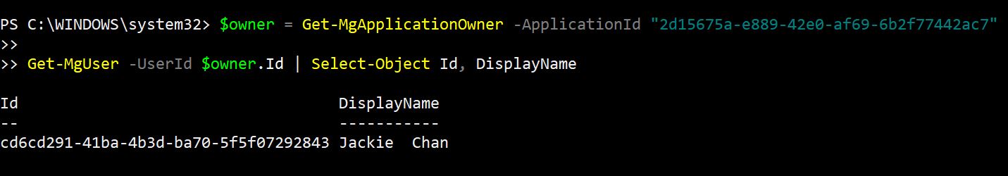 Get-MgApplicationOwner -ApplicationId "2a1b3c4d-5678-90ab-cdef-1234567890ab" -Select "Id DisplayName"
