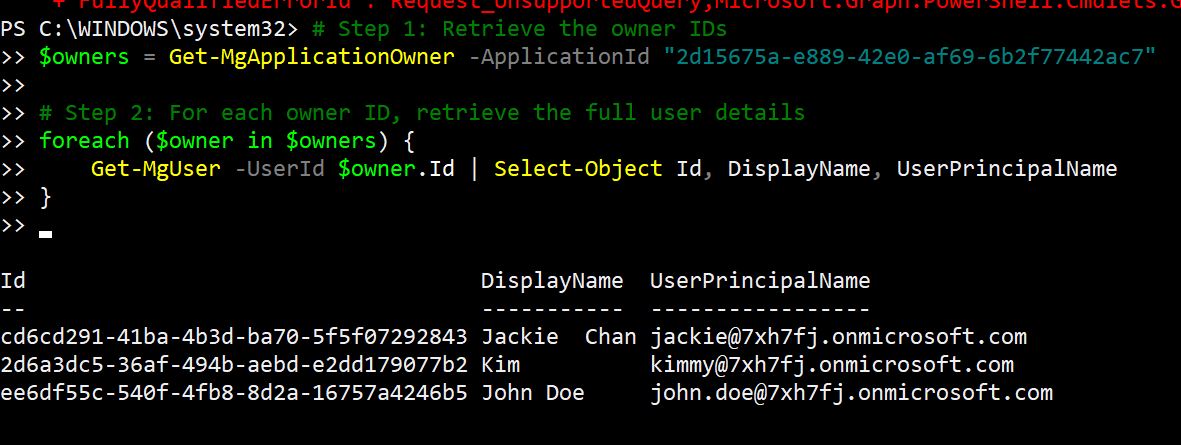 Get-MgApplicationOwner -ApplicationId "2a1b3c4d-5678-90ab-cdef-1234567890ab"