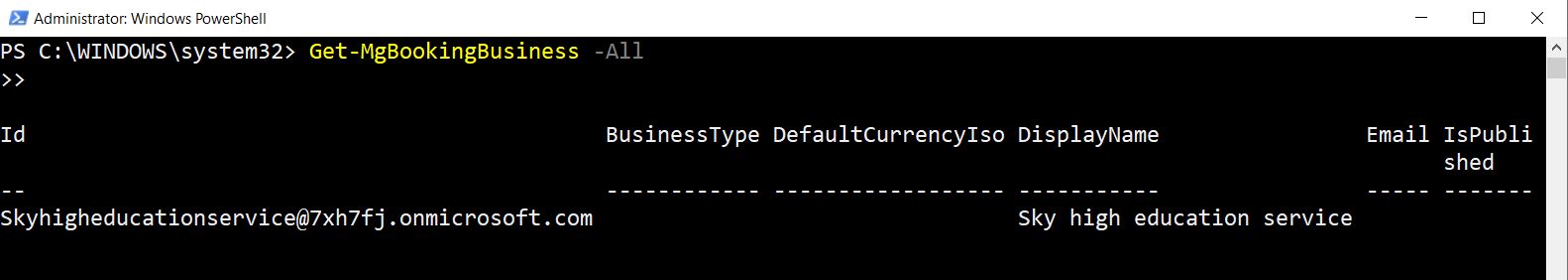 Get-MgBookingBusiness cmdlet will only return results if at least one Microsoft Bookings business calendar has been created in the tenant.displayName, email, and isPublished for ReportingGet-MgBookingBusiness for visibility or audit purposes, pay attention to these key properties: