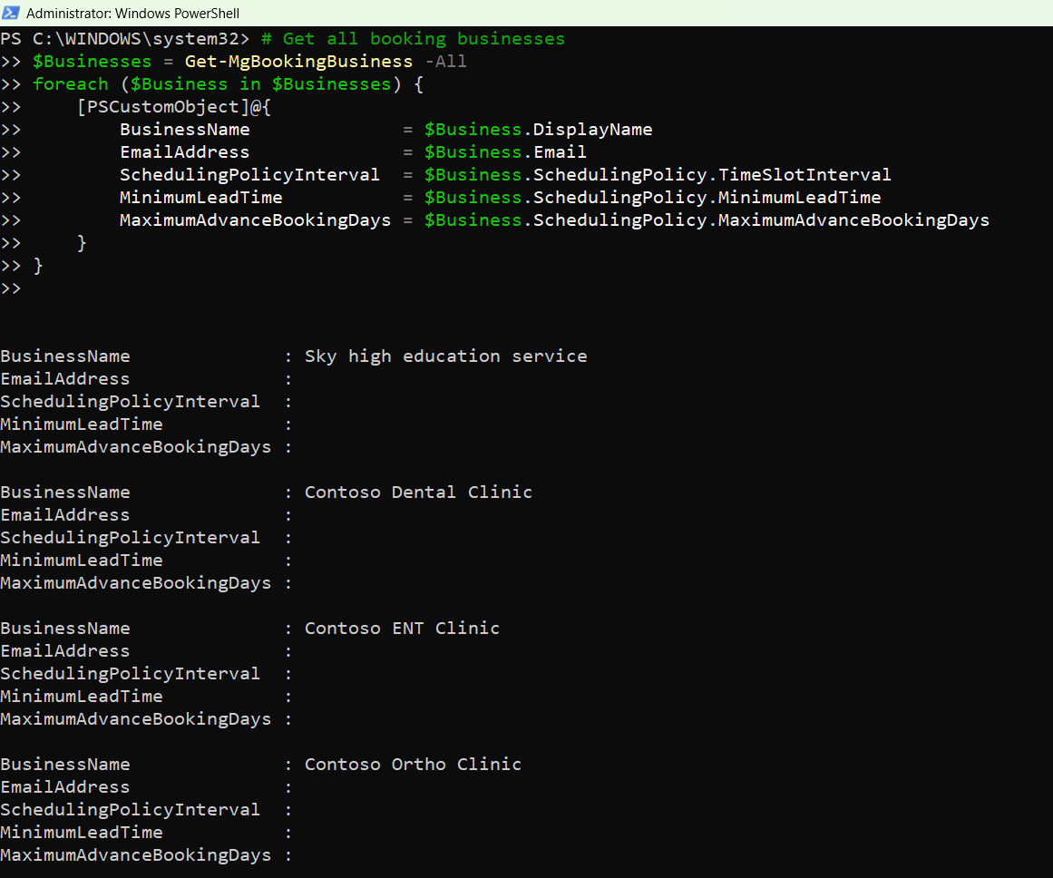 displayName – The name of the bookings businessemail – The mailbox associated with the booking calendarisPublished – Indicates if the booking page is publicly accessibleThe Get-MgBookingBusiness cmdlet is an indispensable tool for managing Booking businesses within an organization. Whether you’re retrieving a single business, filtering businesses based on specific criteria, or managing multiple entities, this cmdlet offers the flexibility and power needed for efficient administration. By mastering its usage, IT administrators can ensure smooth operations, enhance customer satisfaction, and maintain compliance across all Booking services. With this knowledge in hand, you're now equipped to leverage the full potential of the Get-MgBookingBusiness cmdlet in your organization. Happy scripting!