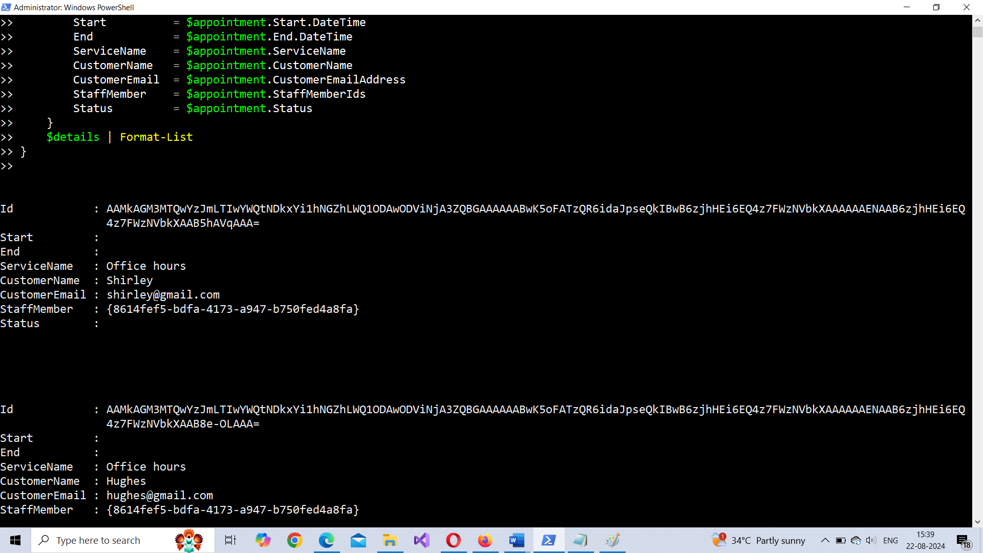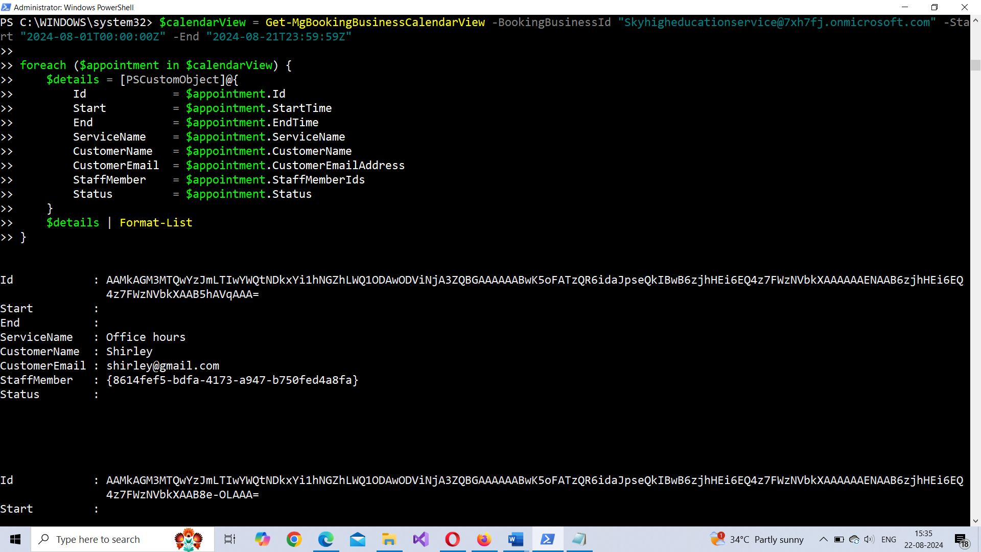 $calendarView = Get-MgBookingBusinessCalendarView -BookingBusinessId "Skyhigheducationservice@7xh7fj.onmicrosoft.com" -Start "2024-08-01T00:00:00Z" -End "2024-08-21T23:59:59Z"