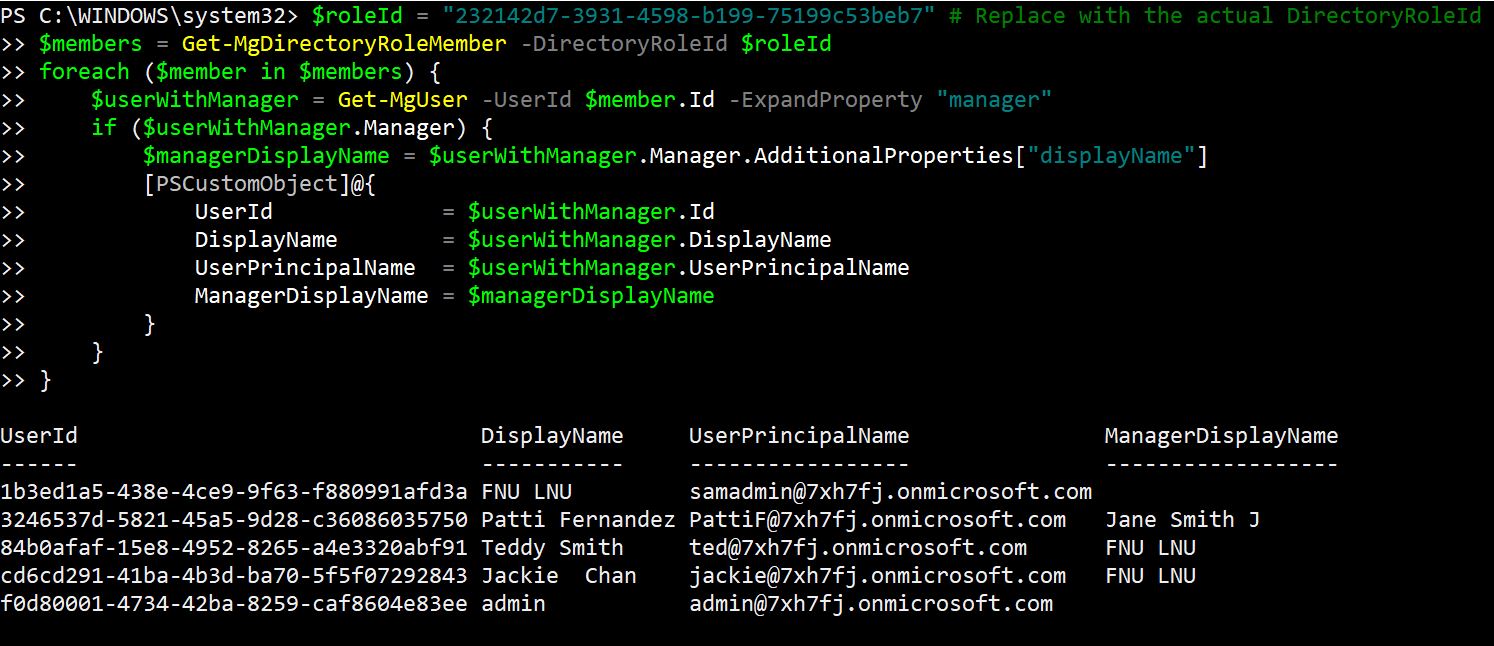 This script retrieves the members of a specific directory role and then expands the manager property to get the manager details. It constructs a custom object to display the user's details along with their manager's display name.