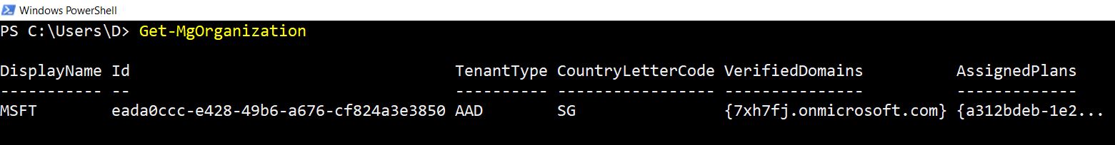 Get-MgOrganization | Select-Object DisplayName, TenantId, Country