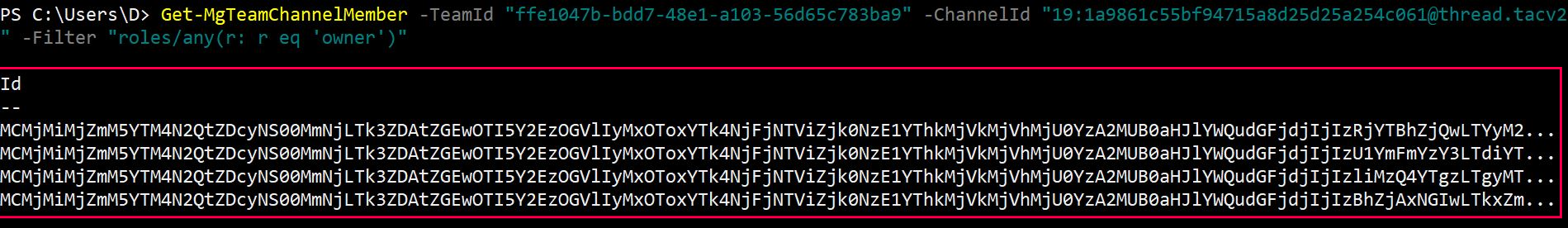 Get-MgTeamChannelMember -TeamId "d58a6e74-23a5-46db-a13f-b9a5625f9f1a" -ChannelId "19:737f2e5b6c4d4d46905d2f1b4bcf6f34@thread.tacv2" -Filter "roles/any(r: r eq 'owner')"