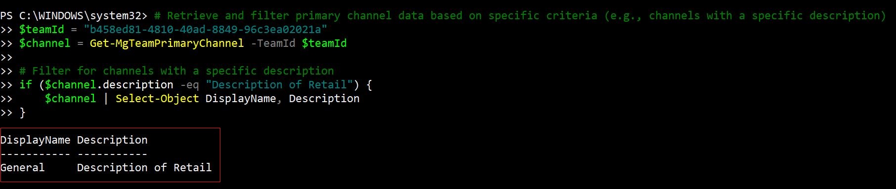 $channel = Get-MgTeamPrimaryChannel -TeamId $teamId