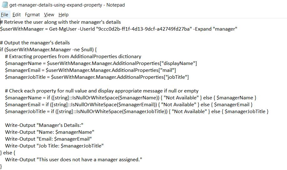 Note: You just need to replace the user id with the user id of your Microsoft 365 user to make the script work. If the user has a manager assigned, then the script outputs the manager's details; if not 'no manager assigned' message gets displayed.