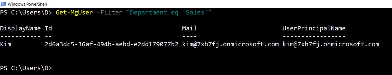 -Filter can be used with Get-MgUser cmdlet to filter the results being fetched. For example, you can filter the results and get only the users of the Sales department.