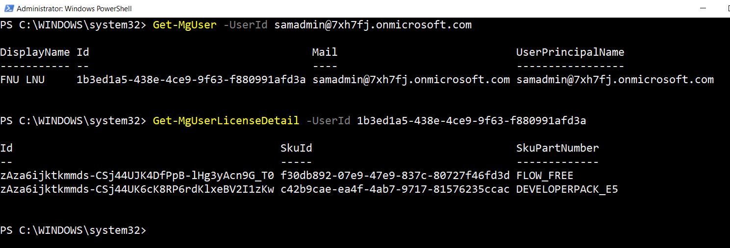 - The fetched User Id should be passed to Get-MgUserLicenseDetail cmdlet to get the user's license info.