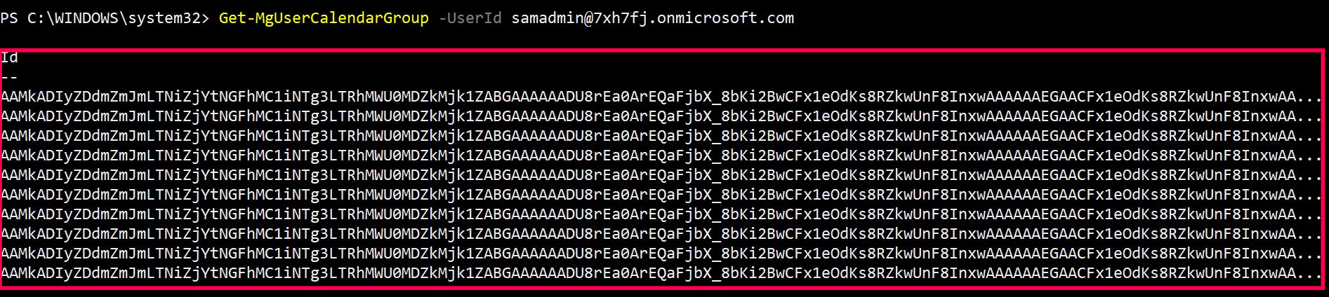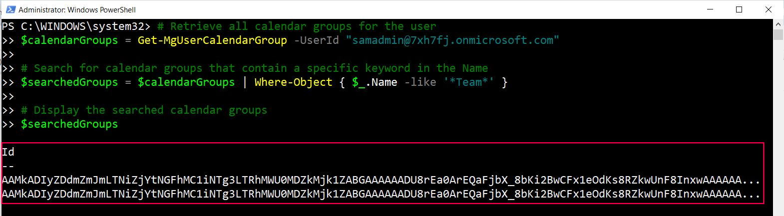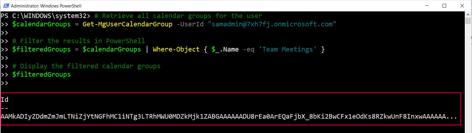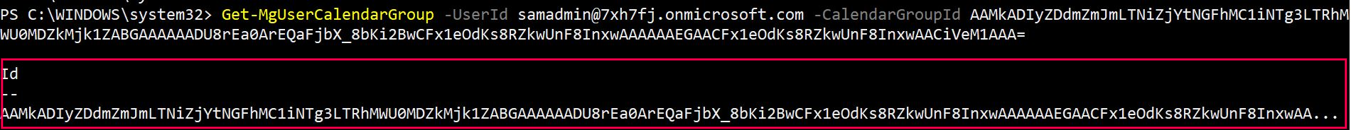 $calendarGroups = Get-MgUserCalendarGroup -UserId "samadmin@7xh7fj.onmicrosoft.com"