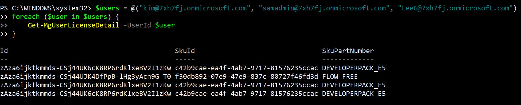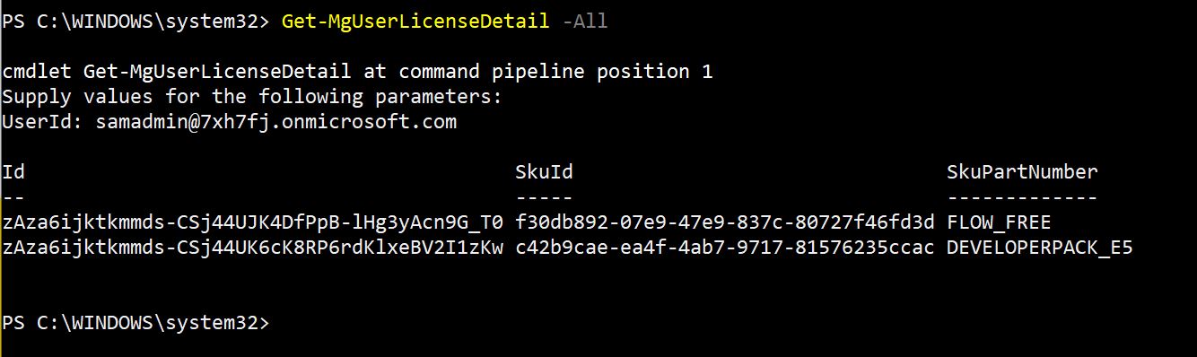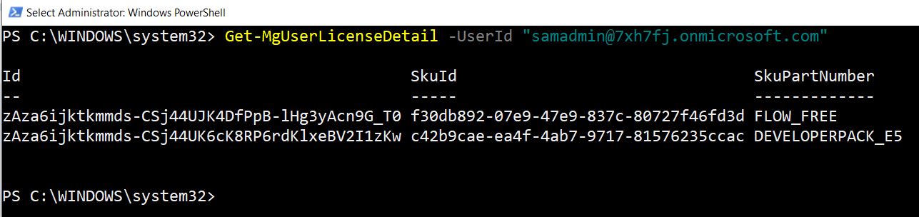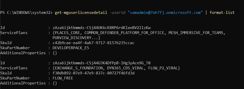 Get-MgUserLicenseDetail -UserId "samadmin@7xh7fj.onmicrosoft.com" | Format-List