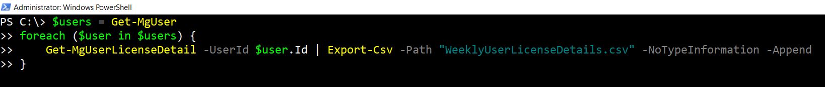 Get-MgUserLicenseDetail -UserId $user.Id | Export-Csv -Path "d:/WeekyUserLicenseDetails.csv" -NoTypeInformation -Append
