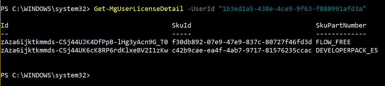 | Empty output despite valid user | The user does not have any licenses assigned. | Confirm the license assignment using:Get-MgUser -UserId