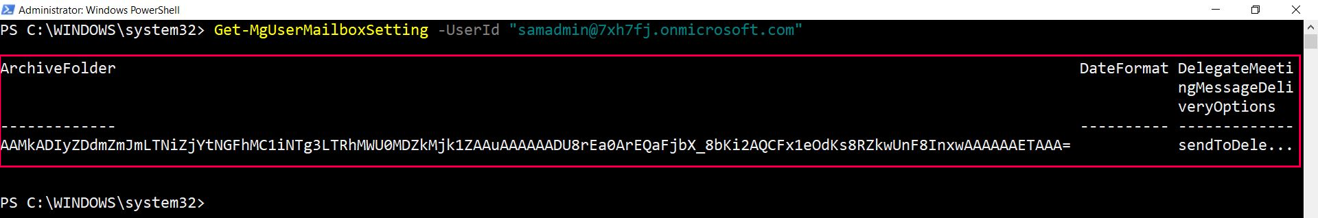 Get-MgUserMailboxSetting -UserId "john.doe@contoso.com"
