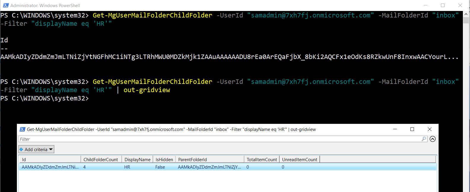 Get-MgUserMailFolderChildFolder -UserId <String> -MailFolderId <String> [-Property <String[]>] [-Filter <String>] []