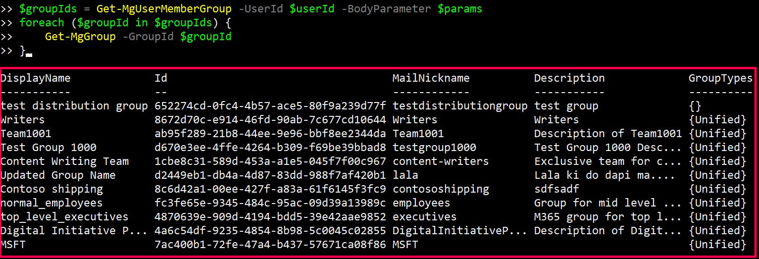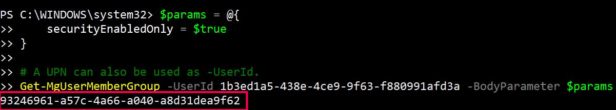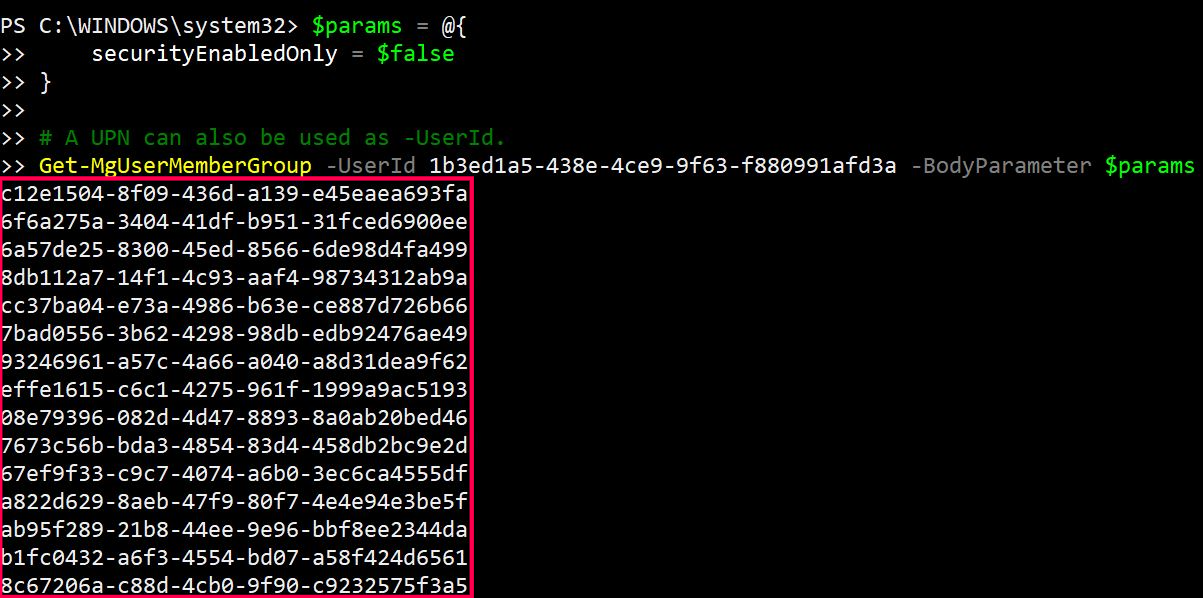 $groupIds = Get-MgUserMemberGroup -UserId $userId -BodyParameter $params