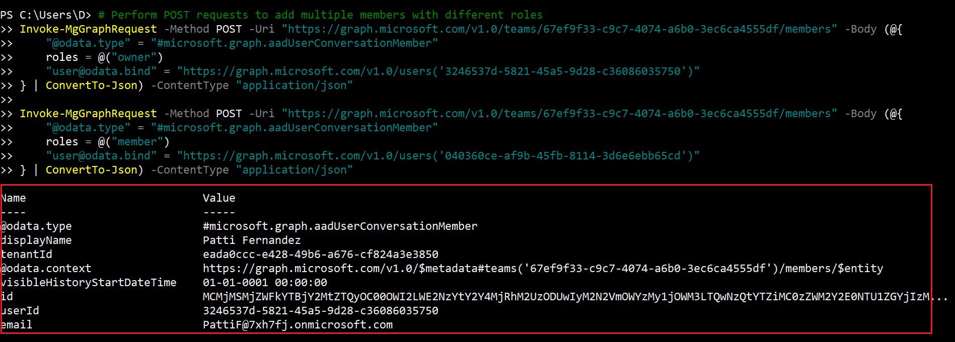 Using Invoke-MgGraphRequest to add team members offers a flexible and powerful alternative to traditional cmdlets. This method provides fine-grained control over how members are added, making it ideal for automation, bulk operations, and role-based member management.