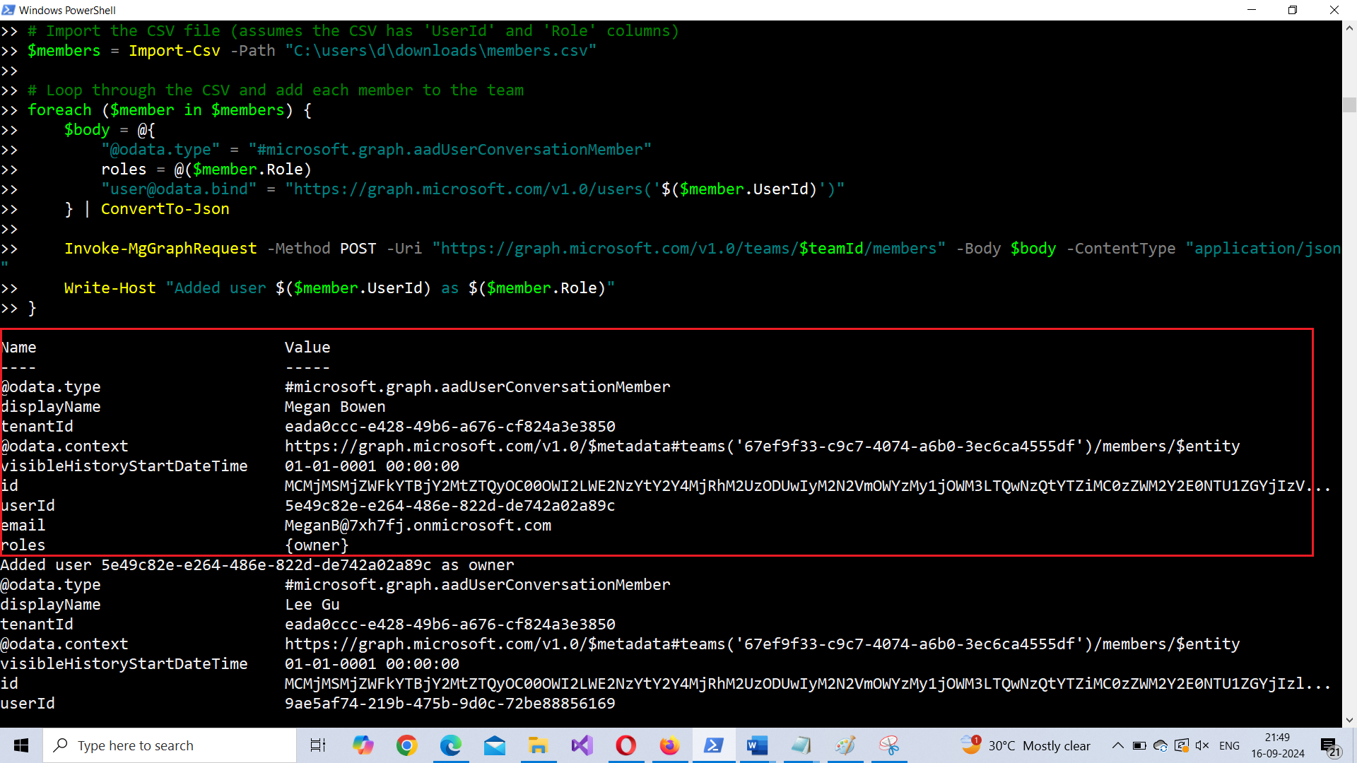 This script reads user IDs and roles from a CSV file and adds them to the specified team. The CSV file should have columns named UserId and Role.