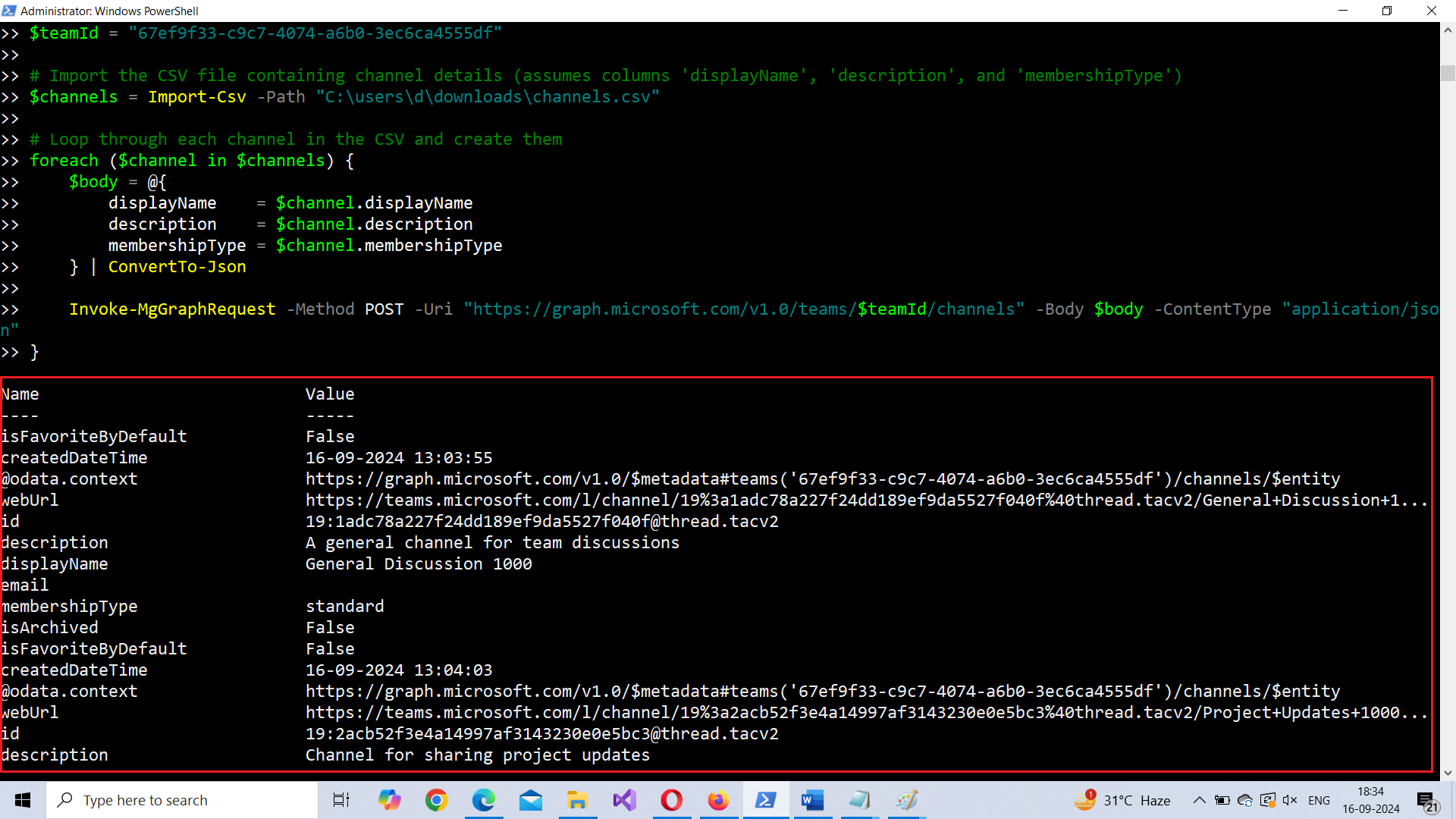 Using Invoke-MgGraphRequest to create Microsoft Teams channels provides a flexible, powerful way to manage channels via the Graph API. Whether you need to create a single channel, multiple channels, or even automate bulk creation via CSV, this method offers more control than standard cmdlets.