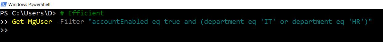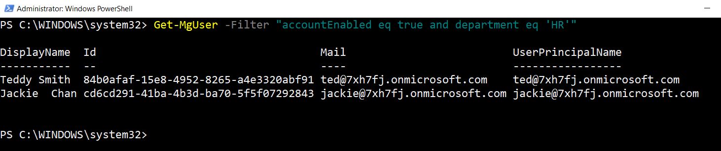 Example Usage: Get-MgUser -Filter "accountEnabled eq true and department eq 'HR'"
