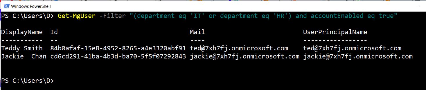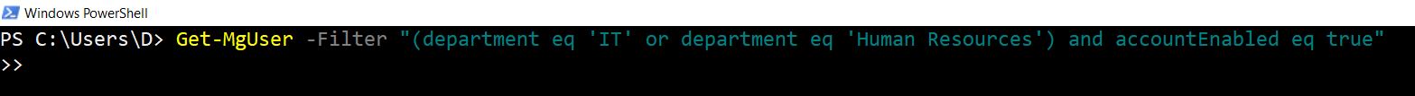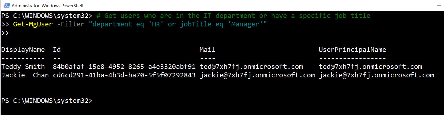 Example Usage: Get-MgUser -Filter "department eq 'HR' or jobTitle eq 'Manager'"