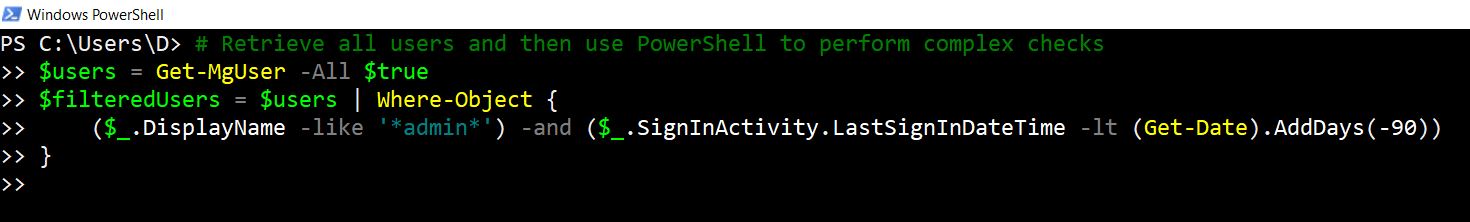 Combine Graph API with PowerShell Logic: Sometimes, the best solution involves a combination of Graph API filtering and further processing with PowerShell logic. Use Graph API to handle bulk of the data reduction and PowerShell for complex logic that might not be directly supported in Graph API queries.