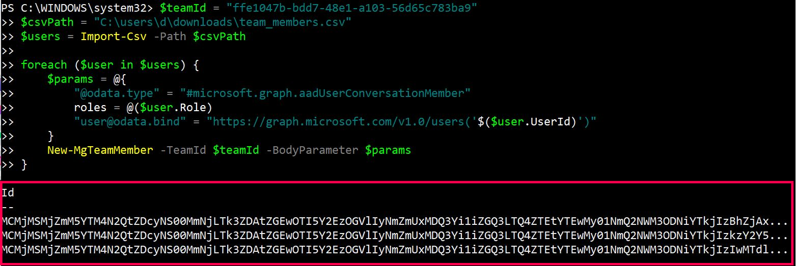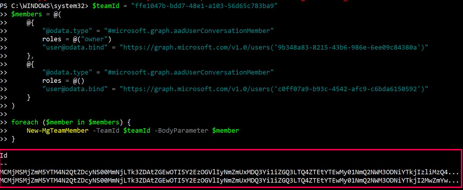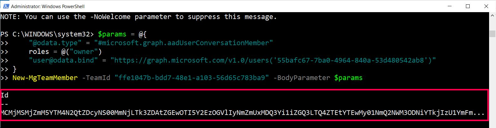 New-MgTeamMember -TeamId $teamId -BodyParameter $params