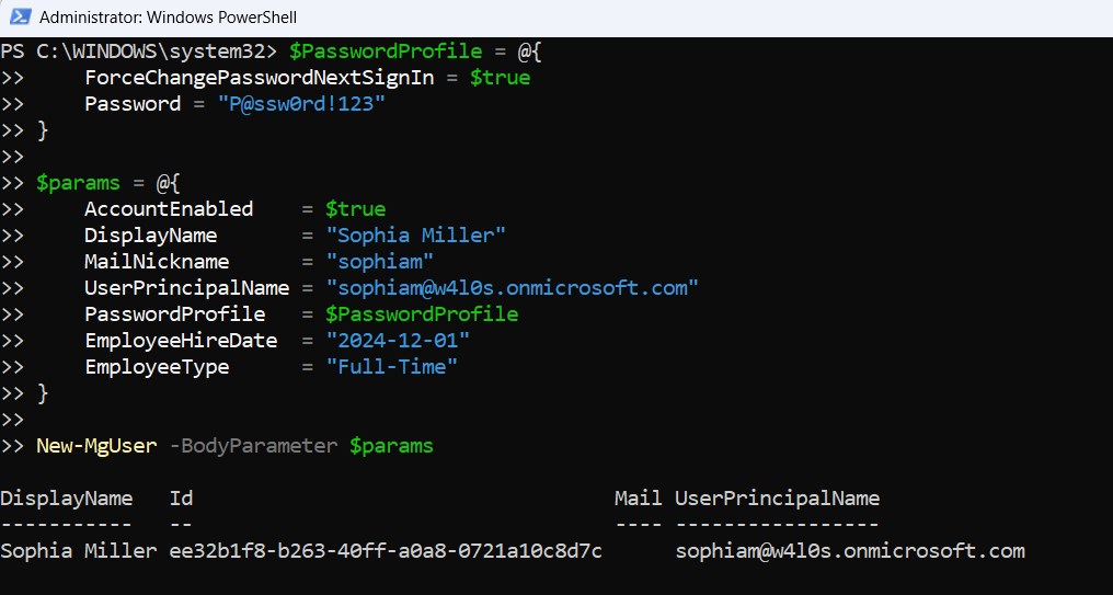 New-MgUser can be passed directly, the passwordProfile must be provided as a nested hashtable. Using a hashtable via $params is the preferred approach — especially useful when automating or bulk-creating users.