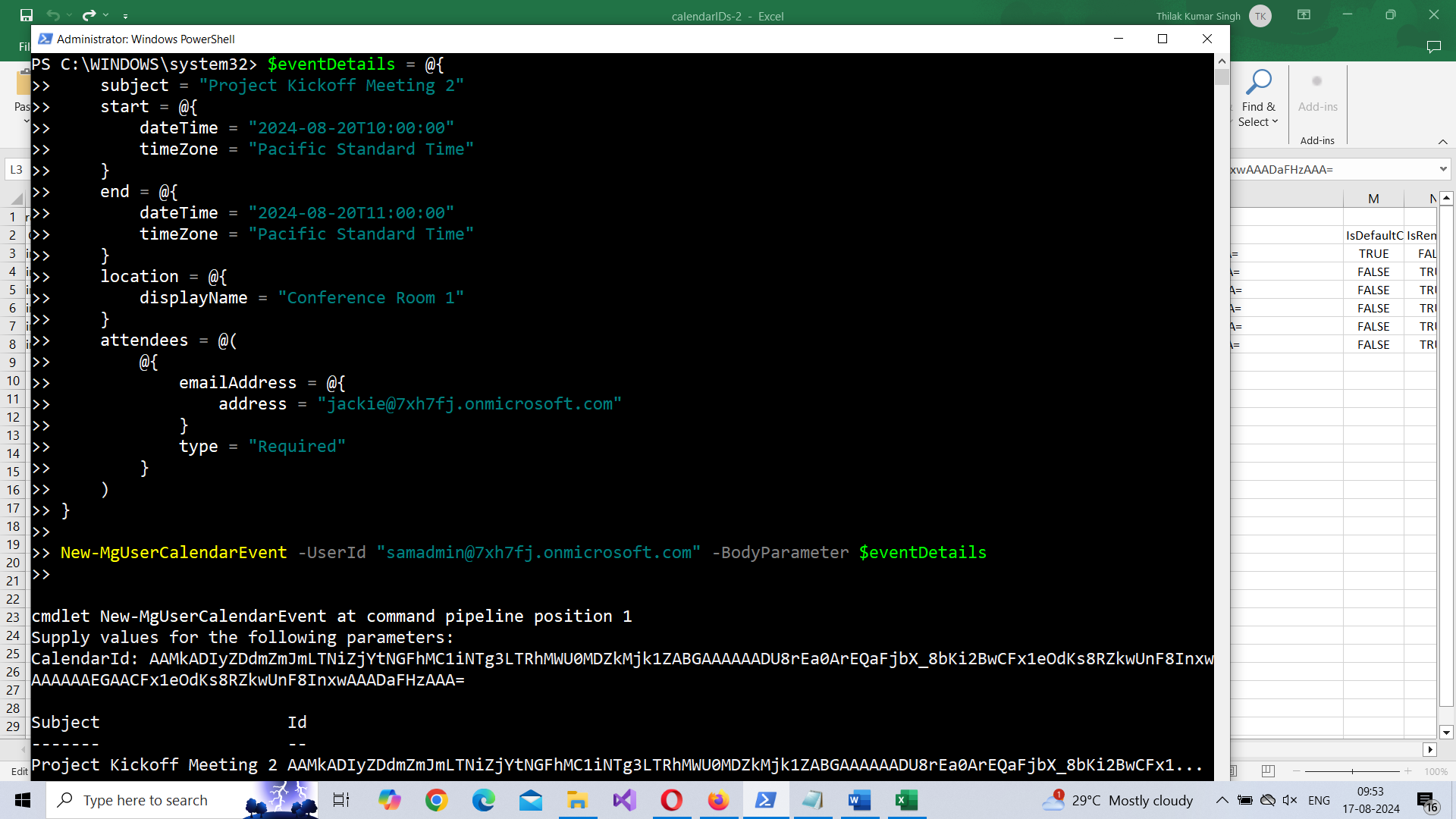 New-MgUserCalendarEvent -UserId "<UserPrincipalName>" -BodyParameter $Body