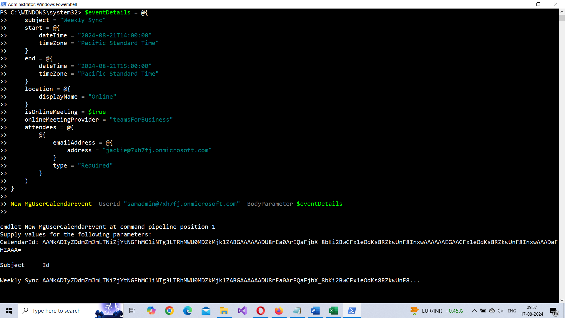 New-MgUserCalendarEvent -UserId "user@domain.com" -BodyParameter $eventDetails