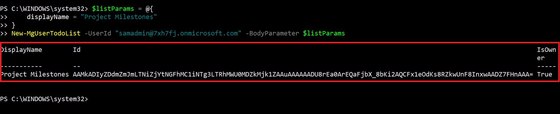 New-MgUserTodoList -UserId $user -BodyParameter $listParams