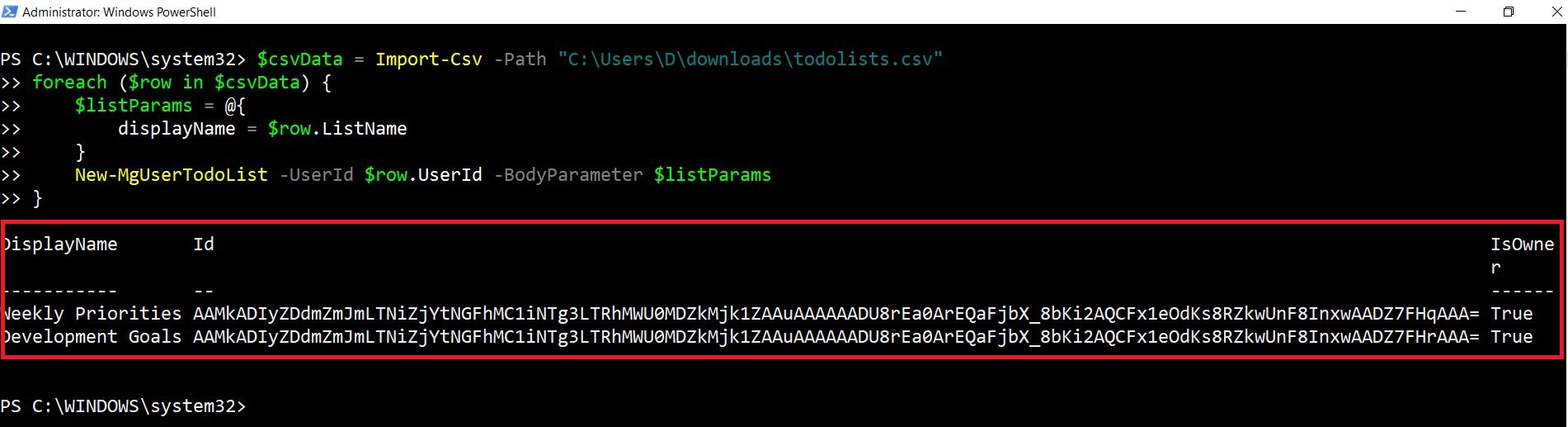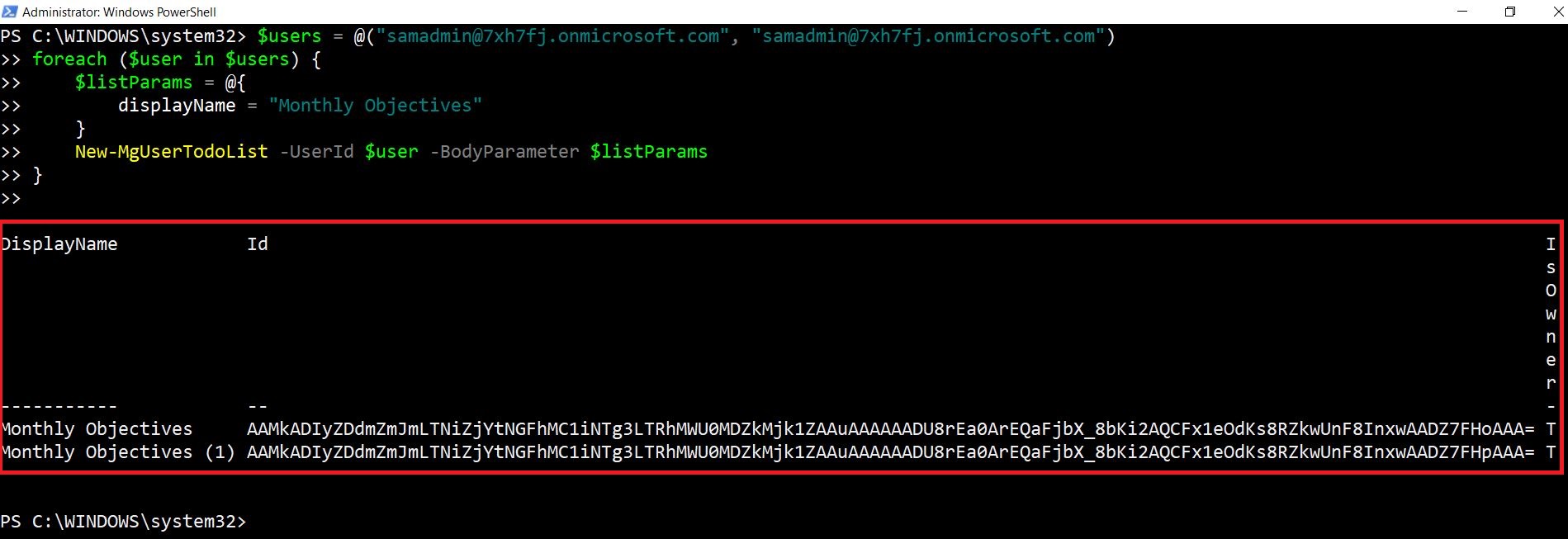New-MgUserTodoList -UserId $row.UserId -BodyParameter $listParams