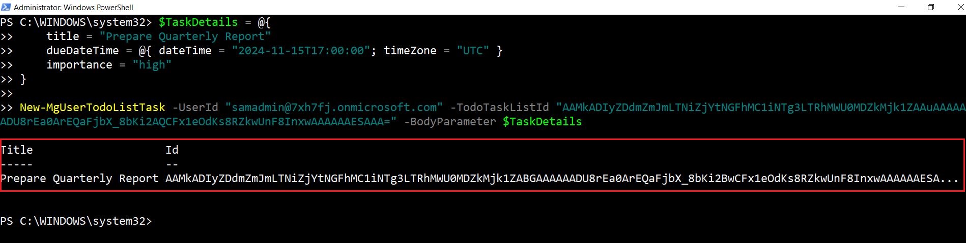 New-MgUserTodoListTask -UserId "john.doe@contoso.com" -TodoTaskListId "A1B2C3D4" -BodyParameter $Task