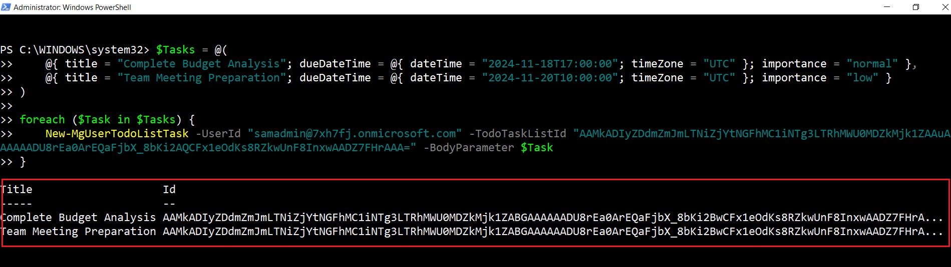 | BadRequest | Incorrect or missing properties in the -BodyParameter. | Ensure required properties such as title and dueDateTime are included. |