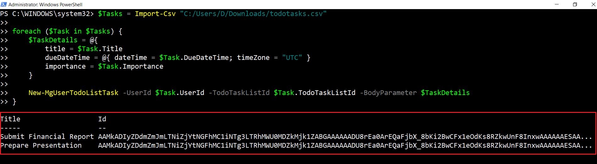 Use a CSV file to create tasks for multiple users. The CSV should contain columns for UserId, TodoTaskListId, Title, DueDateTime, and Importance.
