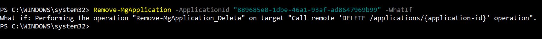 Remove-MgApplication -ApplicationId "12345678-90ab-cdef-1234-567890abcdef" -WhatIf