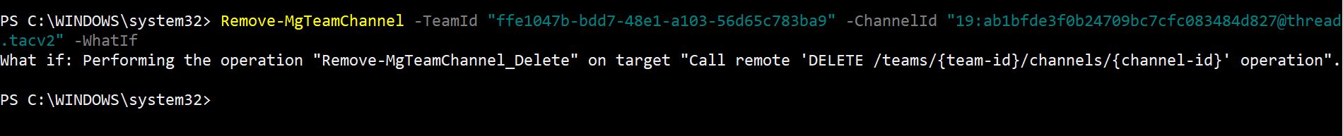 Remove-MgTeamChannel -TeamId "00000000-0000-0000-0000-000000000000" -ChannelId "19:12345678abcdefg@thread.tacv2" -WhatIf