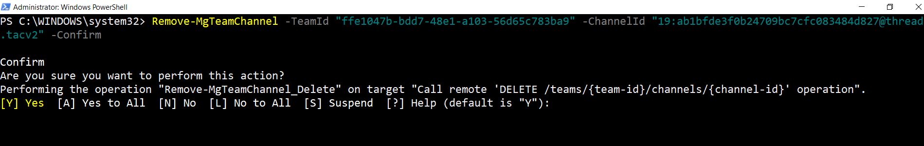 Remove-MgTeamChannel -TeamId "00000000-0000-0000-0000-000000000000" -ChannelId "19:12345678abcdefg@thread.tacv2" -Confirm