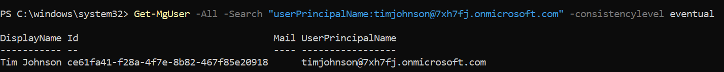 Get-MgUser -All -Search "userPrincipalName:timjohnson@7xh7fj.onmicrosoft.com" -ConsistencyLevel eventual