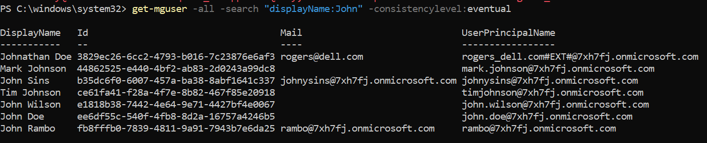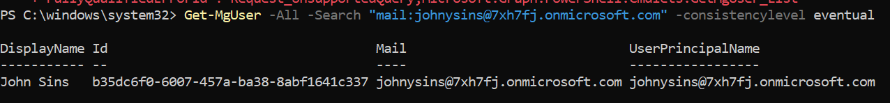 Get-MgUser -All -Search "mail:johnysins@7xh7fj.onmicrosoft.com" -ConsistencyLevel eventual