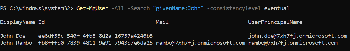 Get-MgUser -All -Search "givenName:John" -ConsistencyLevel eventual