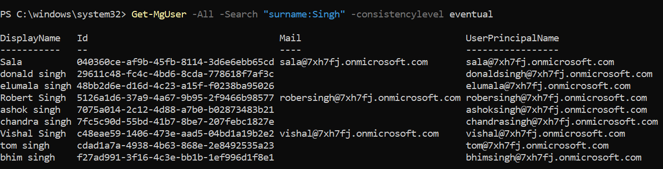 Get-MgUser -All -Search "surname:Singh" -ConsistencyLevel eventual