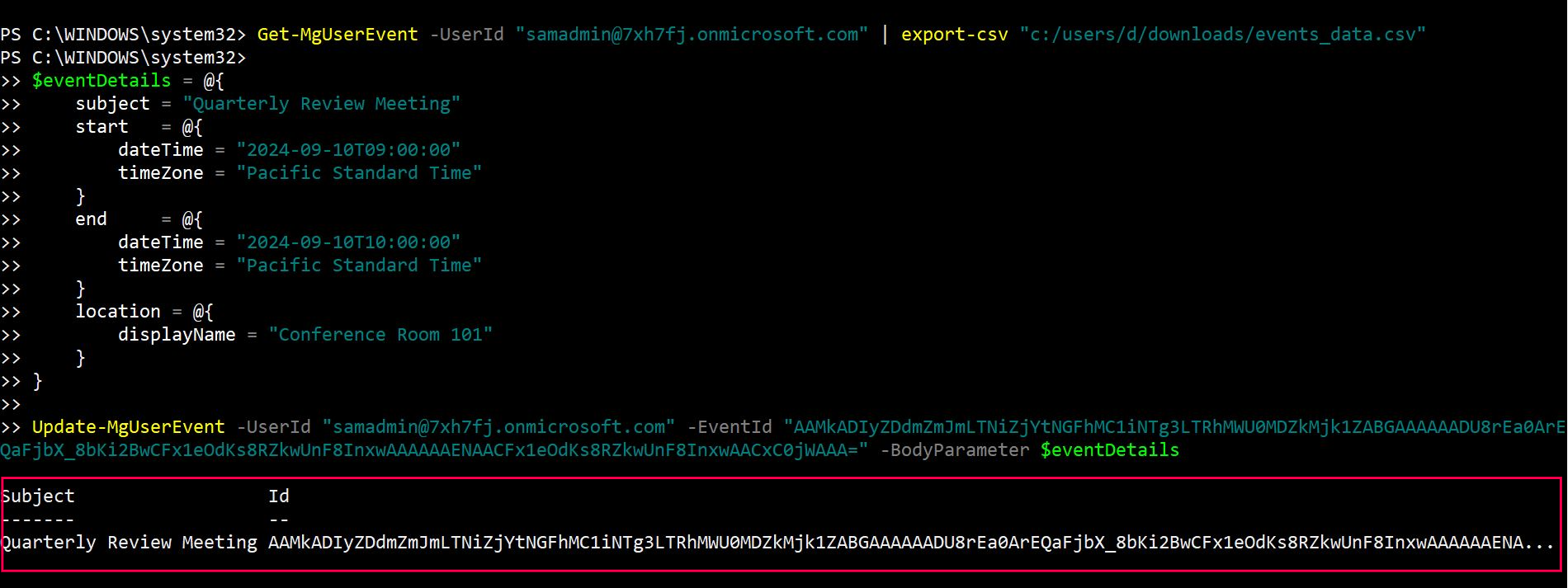 UserId and EventId to Update an EventUpdate-MgUserEvent cmdlet requires both the UserId (owner of the calendar) and the EventId of the event you wish to update.400 Bad Request or 404 Not Found error.