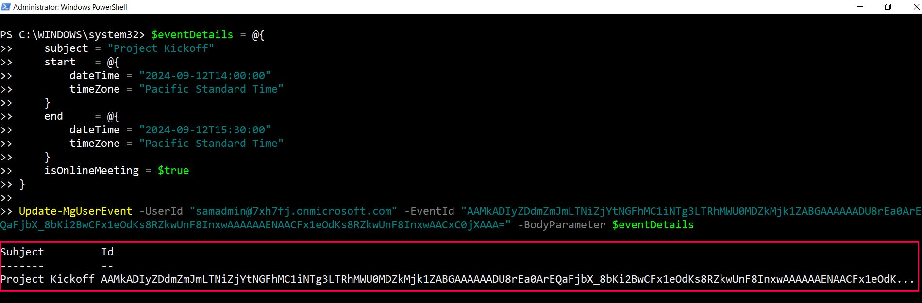 -BodyParameter as a Hashtable-BodyParameter parameter to pass only the fields you want to update, such as subject, start, end, or location.The Update-MgUserEvent cmdlet is a versatile tool for managing Microsoft 365 events. With the ability to modify both online and offline meetings, it can streamline meeting management and ensure that users' calendars remain up-to-date. By adhering to the proper BodyParameter format and following best practices, administrators can confidently manage events without running into errors.