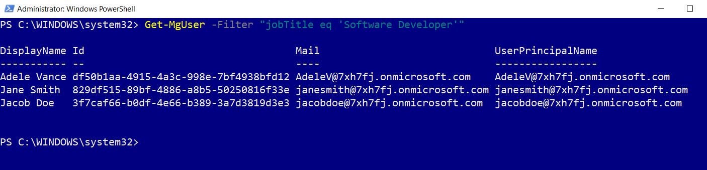 If you want to retrieve users who have a specific job title, such as "Software Developer", you can do the following: Get-MgUser -Filter "jobTitle eq 'Software Developer'"