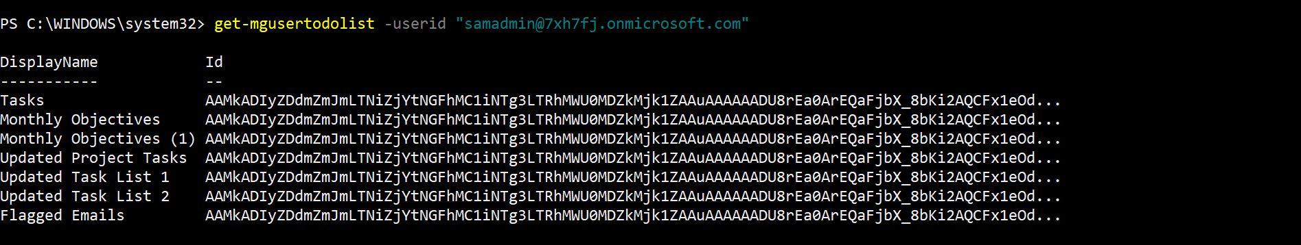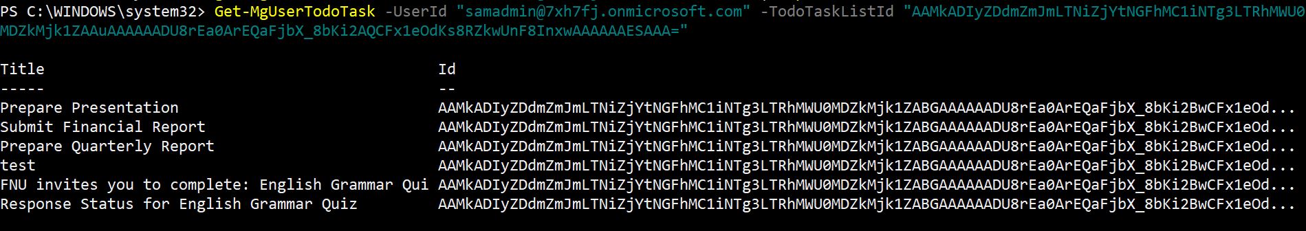 | Task List Not Found | Invalid TodoTaskListId. | Use Get-MgUserTodoList to confirm the correct TodoTaskListId. |