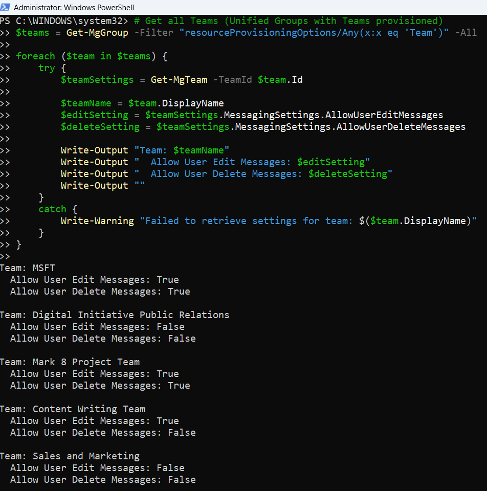 This Graph PowerShell script provides a centralized report by looping through all Teams in your tenant and fetching their message settings. It eliminates the admin pain point of reviewing these settings one team at a time and delivers the results in a clean, readable format.